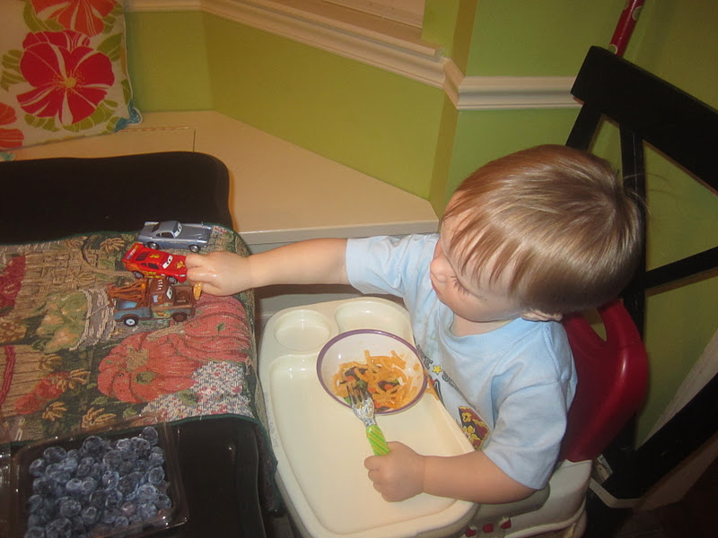 Now that his birthday is over, Benjamin finally gets to play with all of his "boy toys" of his very own and not share with ME! It's only been a few days since he got his new toys, but he's lovin' it! He had to feed all of his cars and trucks dinner on Monday. That's just like girls feeding their baby dolls, right? And I love how he has them all lined up in a row just like ME!